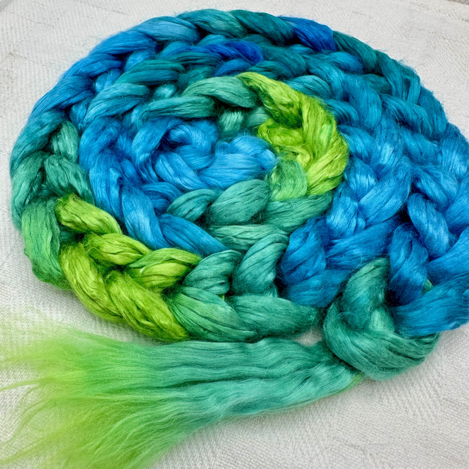 Peduncle combed top is from the "stem" that some of the topcial Tassar (tussah) silk worms make first, to attach themselves securely to the tree, before making their cocoon.