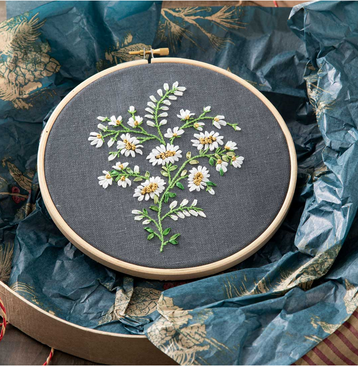 "Marguerite Daisies" designed and stitched by Deanna Hall West for PieceWork magazine, using Treenway Silks threads and ribbons. [photo credit: Matt Graves for PieceWork]