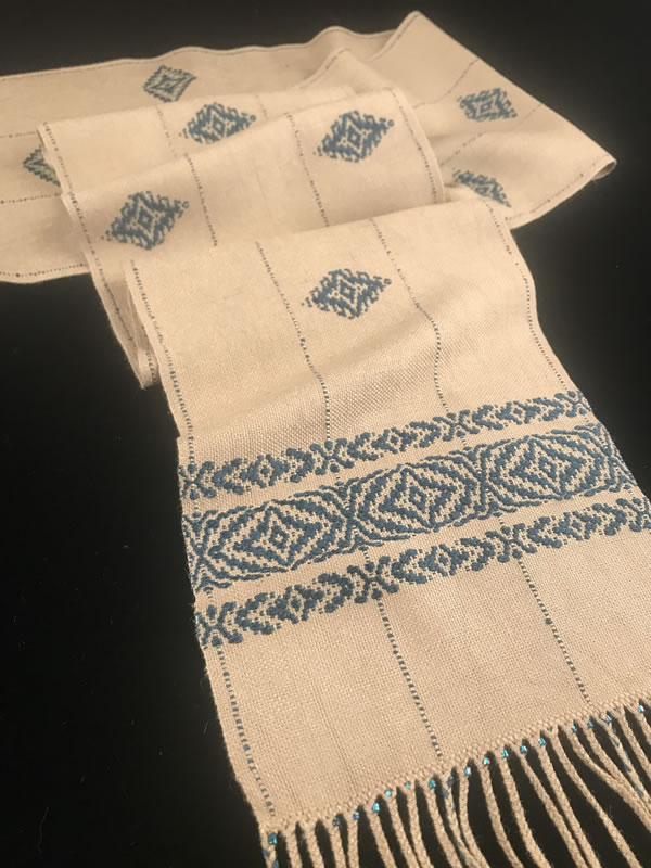 4-shafts is all you need to create this lovely silk scarf with basket weave ground cloth woven with the incomparable muga silk. Reedled silk (yuki), is the pattern weft in the overshot boarders and inlay motifs.  Designed by Anu Bhatia.