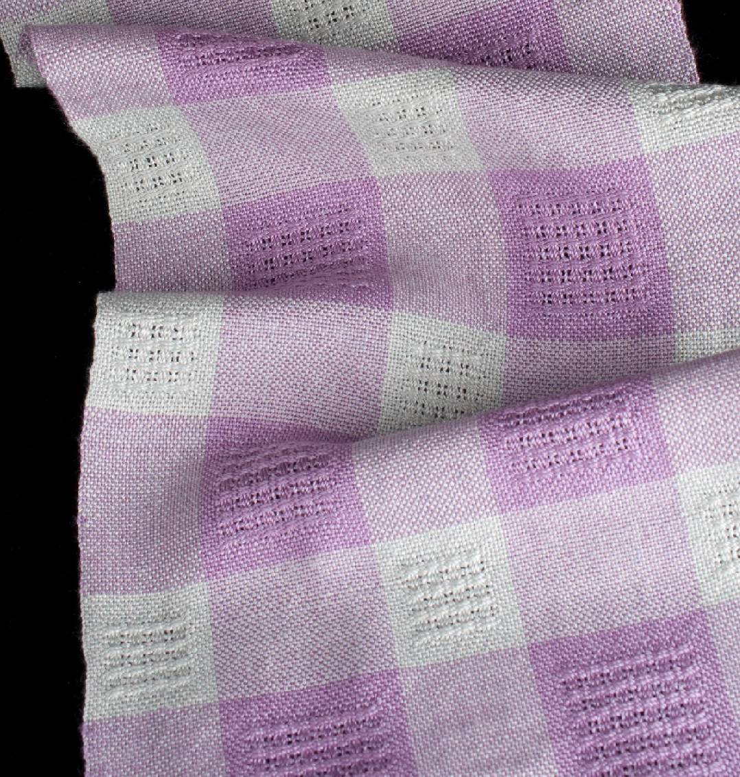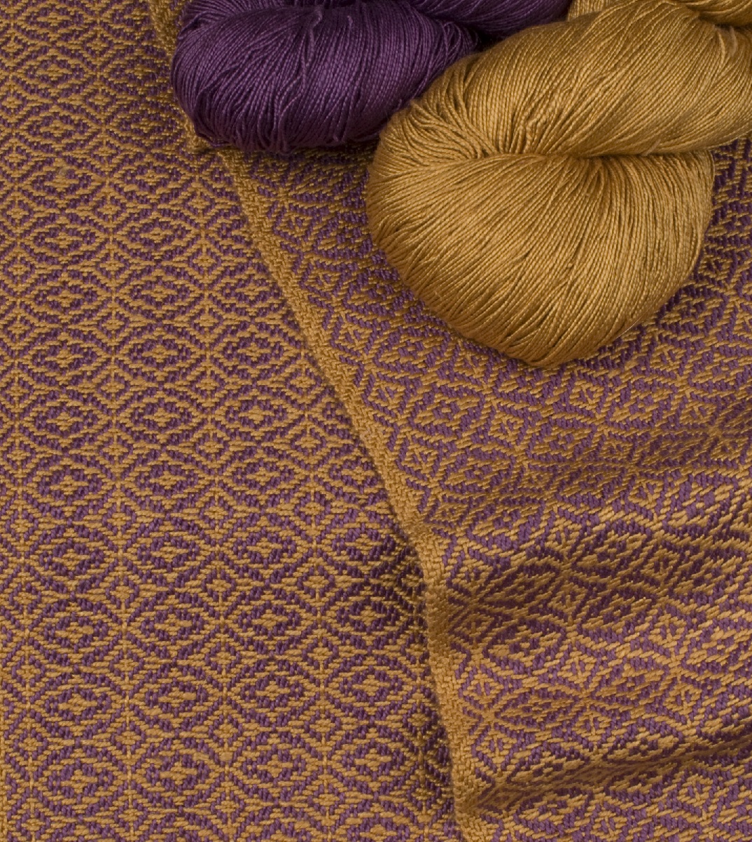 We wove ours with natural dye colors #1014 Lilac in the warp and #1008 Butternut (gold) in the weft (natural dye colors no longer available). Good color substitutions for a similar effect are #9510 Evening Spirit and #435 Butternut.