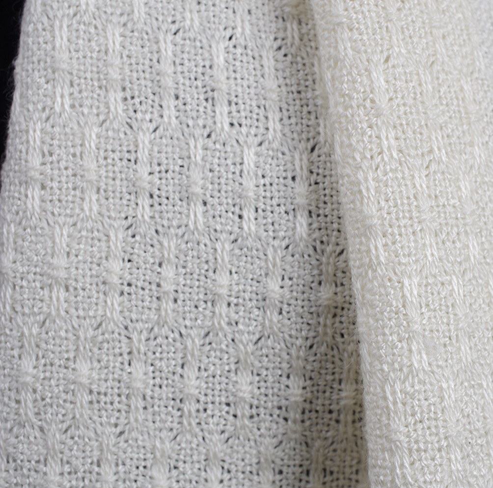 Note--I originally wove the scarves with the warp out of Camelot Blanc (55% Silk/45% whitened camel), but that yarn is no longer available. Gokana feels marvelous and works equally well as a warp. Or you could also use Silken Ankara (55% Silk/45% angora rabbit)