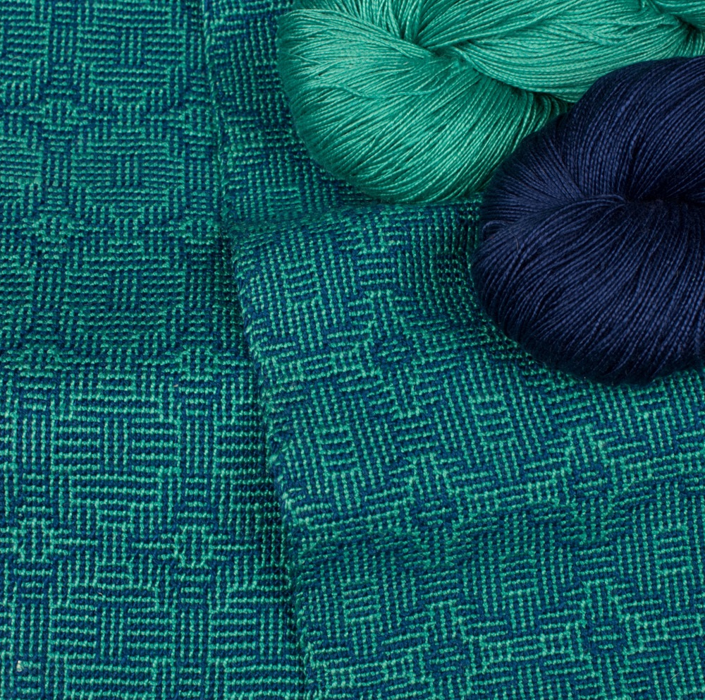Color & Weave uses both colors in the warp and the weft. As Color & Weave needs 2-shuttles, this can be a bit slower to weave, but the intricate design with just 4 shafts makes it one of my favorite techniques.