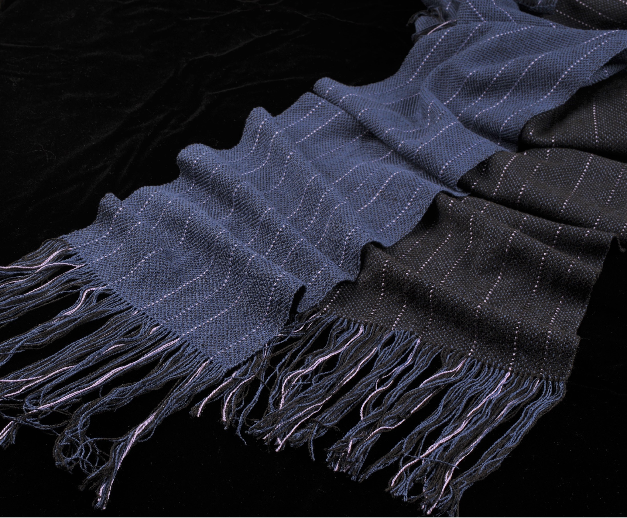 scarf #1 (right) uses equal amounts of both light and dark yarns